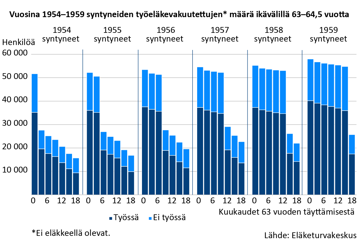 Vanhuuseläkkeen alaikärajan nostaminen on toiminut tavoitteiden mukaisesti. Eläkkeelle siirtyminen on myöhentynyt samassa tahdissa vanhuuseläkkeen alaikärajan nousun kanssa. Kun lisäksi työssä olevien osuus on pysynyt likimain ennallaan uuteen eläkeikään saakka, työnteko 63 vuoden iän täyttämisen jälkeen on lisääntynyt merkittävästi.