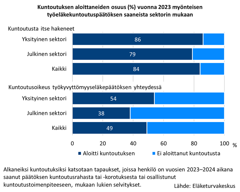 Vuonna 2023 yksityisellä sektorilla kuntoutushakemuksen perusteella myönnettiin kuntoutusoikeus 2 970 henkilölle. Heistä 86 prosenttia aloitti kuntoutuksessa vuoden 2024 loppuun mennessä. Julkisella sektorilla kuntoutushakemus hyväksyttiin 1 390 henkilöllä ja heistä kuntoutuksen aloitti 79 prosenttia.