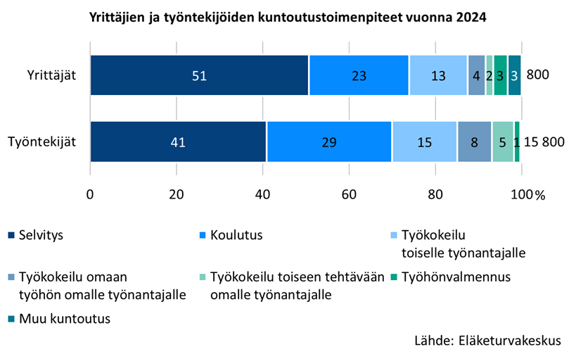 Vuonna 2024 työeläkekuntoutujista 580 oli yrittäjiä. Heidän määränsä väheni 50 henkilöä, eli 8 prosenttia edellisvuodesta. Yrittäjien osuus kuntoutujista oli nyt 5 prosenttia.