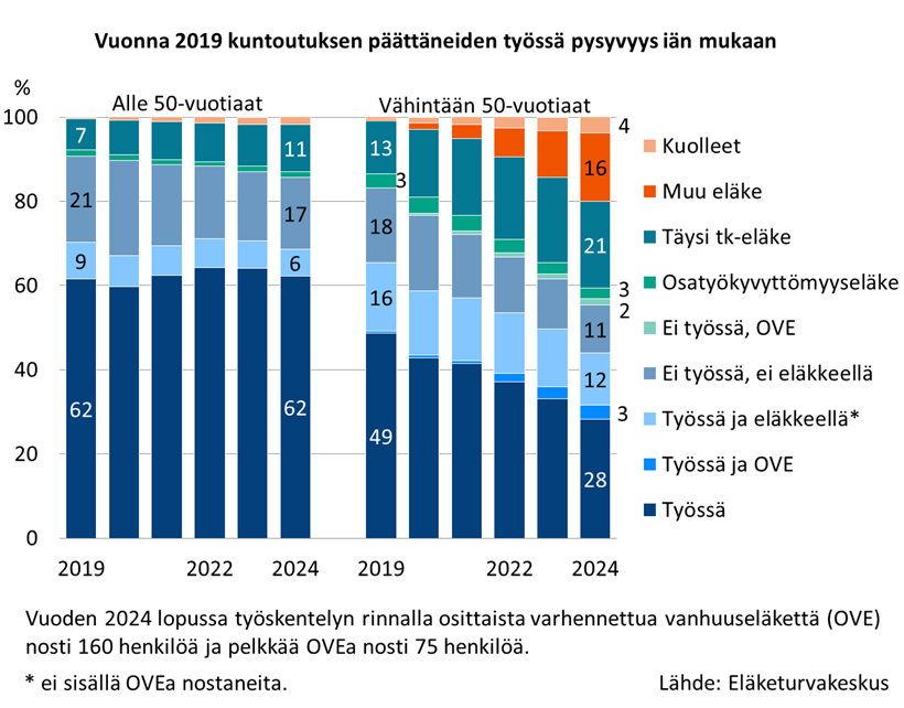 50 vuotta täyttäneillä päätoimisesti työssä käyvien osuus laski viiden seurantavuoden aikana noin 50 prosentista alle kolmannekseen. Työskentelyn rinnalla osittaisen varhennetun vanhuuseläkkeen (OVE) ottaneiden osuus oli 3 prosenttia vuoden 2024 lopussa.