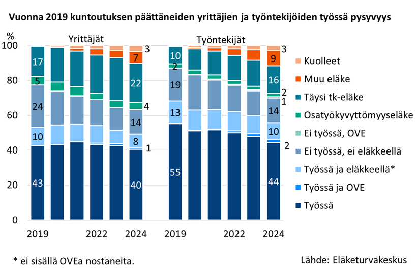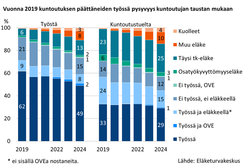 Työstä kuntoutukseen tulleista 62 prosenttia työskenteli kuntoutuksen päättymisvuoden lopussa. Viiden vuoden jälkeen noin puolet oli edelleen työssä. Töitä eläkkeen rinnalla tehneiden osuus pysyi vajaassa 10 prosentissa. Samalla työttömänä olevien osuus laski ja eläkkeelle siirtyneiden osuus nousi. Vuoden 2024 lopussa täydellä työkyvyttömyyseläkkeellä oli 13 prosenttia.