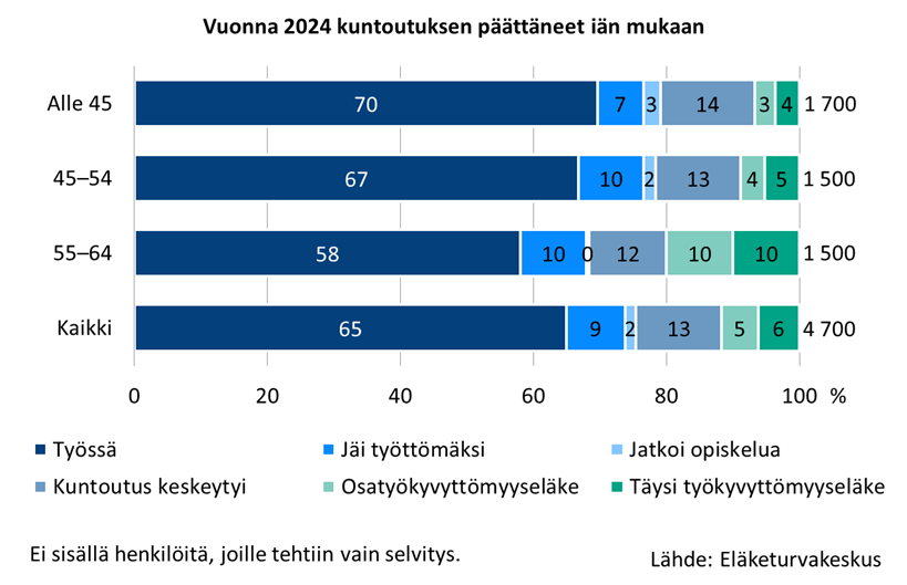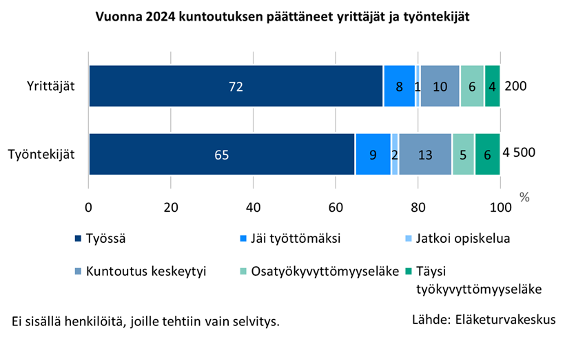 Vuonna 2024 kuntoutuksen päätti 4 700 henkilöä. Heistä 65 prosenttia palasi työhön. Työhön palanneisiin sisältyvät myös henkilöt, jotka jatkoivat työssä työkyvyttömyyseläkkeen rinnalla kuntoutuksen päättyessä.