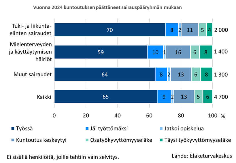 Vuonna 2024 tuki- ja liikuntaelinten sairauden vuoksi kuntoutuksessa olleista 70 prosenttia palasi työhön ja 4 prosenttia jäi täydelle työkyvyttömyyseläkkeelle kuntoutuksen päättyessä. Mielenterveyssyistä kuntoutuksessa olleista työssä jatkoi pienempi osuus, vajaat 60 prosenttia ja 8 prosenttia siirtyi täydelle työkyvyttömyyseläkkeelle. Mielenterveyskuntoutujat keskeyttivät kuntoutuksen jonkin verran muita useammin.